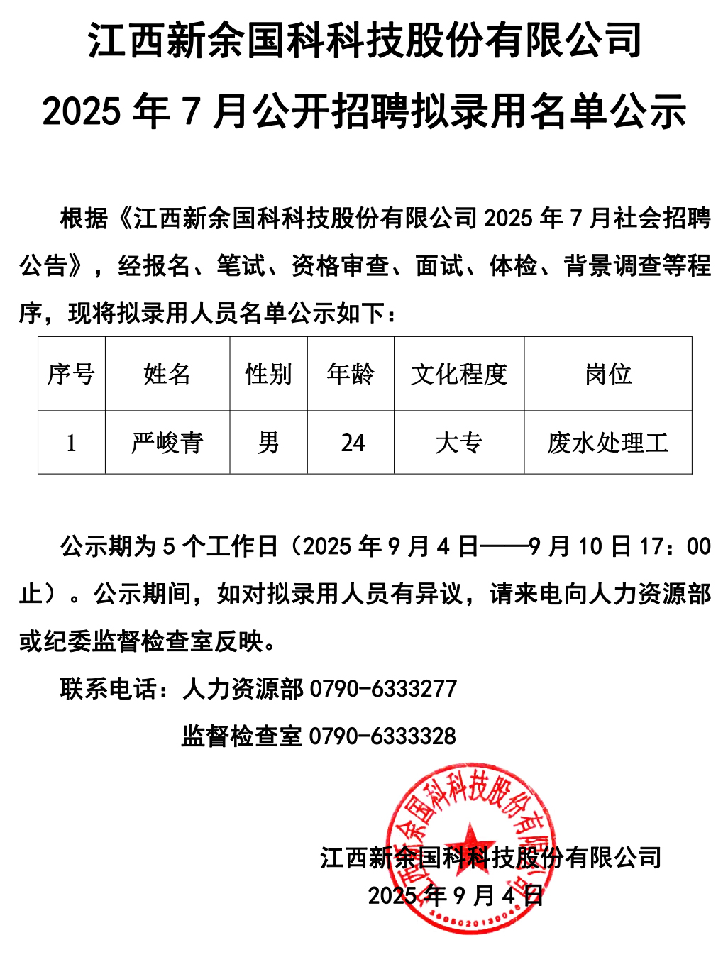 江西新余國科科技股份有限公司2025年7月公開招聘擬錄用名單公示